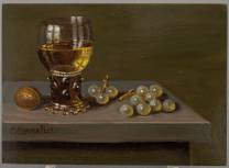 Hollandse School: stilleven met roemer, druiven en walnoot, olieverf op paneel, l.o. gesigneerd C. Cornelisz., 21e eeuw, 13 x 18 cm