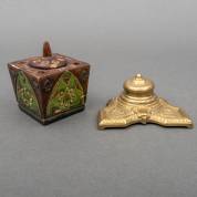 Eén messing inktpotje met porseleinen binnenbakje, uitvoering Mod. Brevet, Frankrijk, jaren '20 en één aardewerken inktpot met glazen binnenbakje, Amsterdamse School -enkele chipjes, gebruikssporen, beschadiging aan glazen binnenbakje-