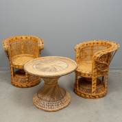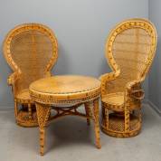 Twee rotan pauwenstoelen en bijpassende tafel met glazen blad, jaren '70 -gebruikssporen-, 155 x 92 x 45 cm
