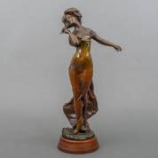 Polychroom beschilderd metalen beeld: jongedame in doorschijnend gewaad, op houten basement, art nouveau-stijl -kleine defecten-, 50 x 22 x 15 cm