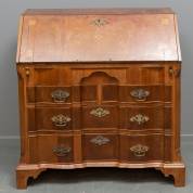 Orgelgebogen mahoniegefineerde secretaire, de klep en de vakverdeling achter de klep met inlegwerk, en onderin vier lades met bronzen beslag, 19e eeuw -defecten en restauraties, defecte onderdelen aanwezig-, 104 x 97 x 53 cm