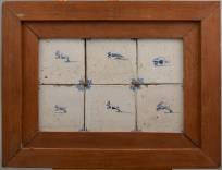 Zes Delfts aardewerk tegels met blauw-wit decor van dieren, 17e eeuw -schilfers-, in houten montuur, 42 x 56 cm