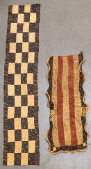 Twee raffia wandkleden met geometrische motieven, waarvan één met golvende rand, Kuba, Democratische Republiek Congo, tweede helft 20e eeuw -gebruikssporen en herstellingen-, 280 x 55 cm