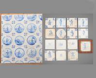 Verzameling aardewerk tegels met blauw-wit figurendecor, 17e-19e eeuw -restauraties, defecten-, daarbij: tegeltableau, opgebouwd uit negen hele en negen halve aardewerk tegels met blauw-wit figurendecor, 19e eeuw, in gipsen zetting -alle tegels gerestaureerd-, 43 x 52 cm