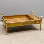 Grote messing bak met handvaten en gedreven decor, aan de rechterzijde een lade, het geheel op klauwpootjes, 20e eeuw, 33 x 90 x 55 cm