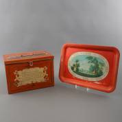 Tabaksvoorraadblik van fabriek J.W. Swane & Zonen, eerste kwart 20e eeuw, en blikken dienblad met landschapsdecor, 28 x 40 x 25 cm