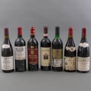 Zeven diverse wijnen, waaronder Bordeaux en Bourgogne -etiketten sleets-, 30 x Ø 8 cm