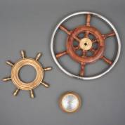 Mahonie stuurwiel met roestvrijstalen hoepel voor boot, daarbij: messing raampje in de vorm van stuurwiel, en bootbarometer, uitvoering Chelsea Clocks -gebruikssporen-, 5 x Ø 45 cm