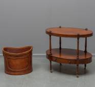 Ovaal taxusgefineerd bijzettafeltje met één schap met twee lades onder het blad, het geheel op messing wieltjes, 20e eeuw -gebruikssporen- daarbij: lederen haardhoutmand, 60 x 66 x 43 cm