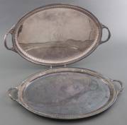 Twee ovale verzilverde dienbladen met handgrepen -één met monogram in het plat, de ander doorgepoetst op ribbelrand, krasjes-, 4 x 71 x 48 cm
