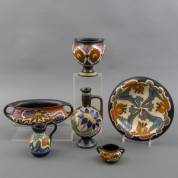 Divers plateel, waaronder: jardinière, kruikje, en sierbord, alle uitvoering Koninklijke Plateelbakkerij Zuid-Holland, Gouda, 23 x Ø 12,5 cm
