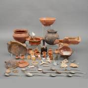 Diverse bodemvondsten: roodbakkend aardewerk, glasfragmenten waaronder met braamnoppen, mogelijk van een berkemeyer, amberkleurig glazen medicijnflesje, gespje, kopjes van pijpjes, lepels, etc.