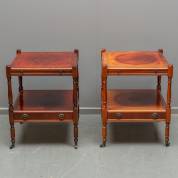 Paar verrijdbare mahonie bijzettafeltjes met lade en etagère, tweede helft 20e eeuw -één verkleurd-, 60 x 48 x 48 cm