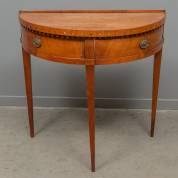 Mahonie halvemaantafeltje met twee lades en messing accenten in de opstaande rand, Hollands, Louis Seize -defecten-, 77 x 79 x 41 cm