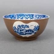 Creamware capucijner kom met blauw-witte landschapsdecors, vermoedelijk uitvoering Worcester, niet gemerkt, tweede helft 18e eeuw -krasjes-, 7 Ø15 cm