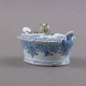 Delfts aardewerk botervlootje met blauw-wit decor, het dekseltje bekroond door een geel-groengeschilderde goudbes met bladeren, uitvoering De Porceleyne Byl, midden 18e eeuw -kleine randschilfers-, 10 x 14 x 11 cm