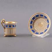 Porseleinen kabinetkopje op onderschotel, met goud-wit gestreept decor met blauwe banden, 19e eeuw -handvat kopje defect en gekramd-, 9,5 x Ø 8,5 cm