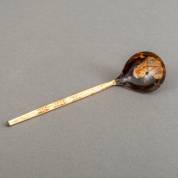 Benen en schildpad lepel met geschilderd bloemdecor op de steel en een vrouwenportret in de bak, vermoedelijk een sorbetlepel uit het Ottomaanse rijk, 19e eeuw -restauratie bij aanhechting bak en enkele chipjes-, 21 x 6 x 7 cm