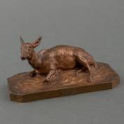 Pierre Jules Mène (1810-1879), bronzen beeldje: liggend hert, gesigneerd, 6 x 12,5 x 7 cm