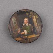 Lakwerk papier-maché snuiftabaksdoos met beschilderd deksel: zittende jongeman met glas in de hand en geschoten vogel, in de stijl van Johann Heinrich Stobwasser, 19e eeuw -defecten-, 2,5 x Ø 10,5 cm