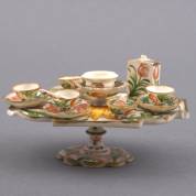 Beschilderd albasten poppenhuisservies met rood en groen tulpendecor, vermoedelijk Engels, circa 1700, bestaande uit: tafel, theebus, suikerpot, vijf kommetjes en vier schoteltjes, lepeltje en tazza -defecten-, eenzelfde, maar minder uitgebreid theeservies bevindt zich in de collectie van het Victoria & Albert Museum, Londen, een albasten theeservies met vergelijkbare decoratie bevond zich in het poppenhuis van Ann Sharp (1691-1771), 4,7 x 15,5 x 10,8 cm