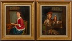 Paar portretten naar Gabriël Metsu (1629-1667): geleerde man en lezende vrouw, olieverf op paneel, het portret van de vrouw rechtsonder onduidelijk gesigneerd, 19e eeuw, 24,5 x 19,5 cm