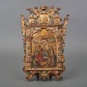 Oosters-orthodoxe icoon: Mètèr Theou, gekroond door twee engelen, met Christus op schoot, in gesneden, vergulde en gepolychromeerde houten omlijsting, 18e eeuw, 57 x 32 x 3 cm