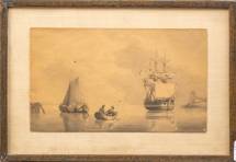 Albertus Hendricus Huysman (1821-1903), schepen op kalm water, inkt op papier, verso gesigneerd en gedateerd 1846, 9 x 15 cm
