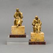 Paar verguld bronzen beeldjes: Voltaire, naar voorbeeld van Jean Antoine Houdon (1741-1828), en mogelijk Rousseau, beide gezeten op stoel, beide op natuurstenen basement, 19e eeuw, 16 cm