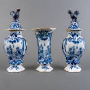 Driedelig Delfts aardewerk kaststel met blauw-wit decor: man en vrouw aan tafel in cartouche, gemerkt, 18e eeuw -restauraties en defecten-, 29 x 11 x 8 cm