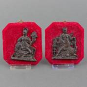 Paar bronzen reliëfjes: personificaties van het continent Europa en van Azië, 19e eeuw, op rode velours plankjes, 12 x 11 cm