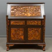 Een hardhouten secretaire met rijk gestoken panelen, Zuid-Oost Azië, midden 20e eeuw -gebruikssporen-, 112 x 98 x 40 cm