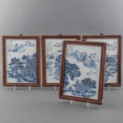 Vier Chinees porseleinen plaquettes met blauw-wit transferdecor: rivierlandschappen, 35 x 25 cm
