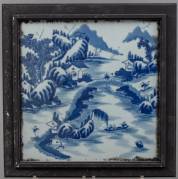Vierkante Chinees porseleinen plaquette: besneeuwd rivierlandschap met brug en figuren, 29 x 29 cm