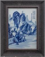 Chinees porseleinen plaquette met blauw-wit decor: rivierlandschap, 49 x 38 cm