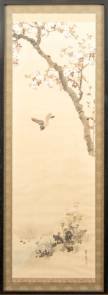 Japanse schildering in lijst: vogel bij bloesemboom, kleur op zijde, r.o. gesigneerd, 102 x 33 cm