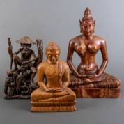 Drie diverse houtsnijwerken: twee Boeddha's, modern -krimpscheuren-, Indonesische visser -lichte defecten-