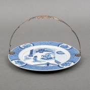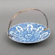 Chinees porseleinen schotel met blauw-wit floraal decor in lotusbladvormige cartouches, gemerkt, Kangxi, met 2e gehalte zilveren hengsel, 1855 -barst in schotel-, 4.5 x Ø 28 cm