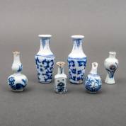 Zes Chinees porseleinen miniatuurvaasjes, waaronder een paar, 17e en 18e eeuw -vier kleine vaasjes met gechipte hals, Imari vaasje ook met chips in standring-, 9 x Ø 4 cm