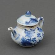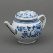 Chinees porseleinen theepotje met blauw-wit floraal decor, Qianlong, de deksel gemaakt van de bovenzijde van een zoutvat, 11 x 18 x 11 cm