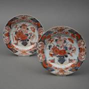 Paar Japans porseleinen Imari borden met bloemenvaasdecor, 18e eeuw, 3 x Ø 22 cm