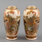 Paar Japanse Satsuma vazen met gespiegeld decor: twee vrouwen in kimono, wandelend in een tuin, gemerkt, Meiji, 16 x 8 Ø cm
