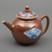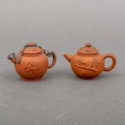 Paar miniatuur Yixing theepotten met reliëfdecor van bloesemtakken, 18e eeuw -bij één theepotje zit het dekseltje vast met een zilveren kettinkje, omdat het deksel geen binnenrand heeft, het andere theepotje heeft een chip van de hals en de greep is gelijmd-, 5 x 7.5 x 5 cm