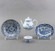 Divers blauw-wit Chinees porselein: theepotje -tuit gechipt-, kommetje, ovaal bordje met gecontourneerde rand -randchipjes-, en papbordje -randchipjes-, 12 x 15 x 10 cm
