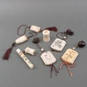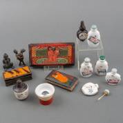 Zeven snuifflesjes met erotische voorstellingen, China, 20e eeuw, daarbij: andere objecten met erotische voorstellingen, en een dekseldoosje