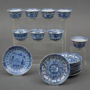 Vijf Chinees porseleinen kommetjes en negen schoteltjes met blauw-wit floraal decor, drie Chinees porseleinen kommetjes en schoteltje met vis- en krabdecor, 17e/18e eeuw -defecten-, 7 x Ø 13 cm