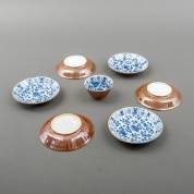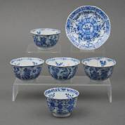 Chinees porseleinen capucijner kommetje en zes bijbehorende schoteltjes met blauw-wit bloemdecor, 18e eeuw, 4 x Ø7 cm
