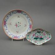 Chinees porseleinen famille rose schaaltje op hoge standring met floraal decor, en Chinees porseleinen famille rose schotel met floraal decor, 19e/20e eeuw -defecten-, 5 x Ø 28 cm
