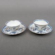 Paar Chinees porseleinen kommetjes en schoteltjes met verguld blauw-wit decor van landschapjes in cartouches, gemerkt, Kangxi/Yongzheng -randschilfers, één kommetje gelijmd, één schoteltje met haarlijn-, 3.5 x Ø 7 cm