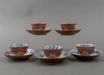 Vijf Chinees porseleinen capucijner kommetjes en schoteltjes met blauw-wit floraal decor, eerste helft 18e eeuw -één schotel met chipje, één kommetje gebroken en gekramd-, Ø12 cm